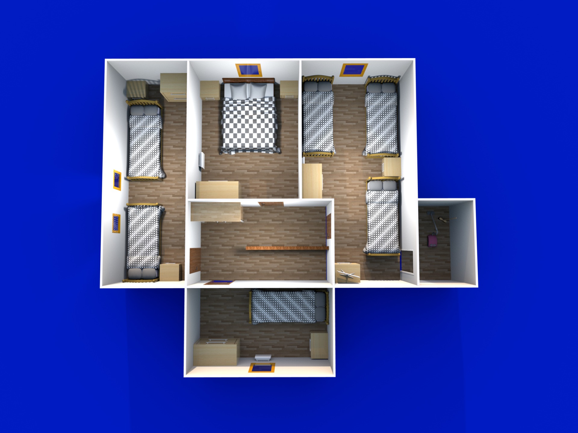 V patře se nachází čtyři samostatné pokoje. První s jednolůžkem, druhý se dvěma jednolůžky, třetí s jedním dvoulůžkem a čtvrtý se třemi jednolůžky a šatnou. Dále podesta s posezením. V šatně je k dispozici dětská postýlka a židlička.