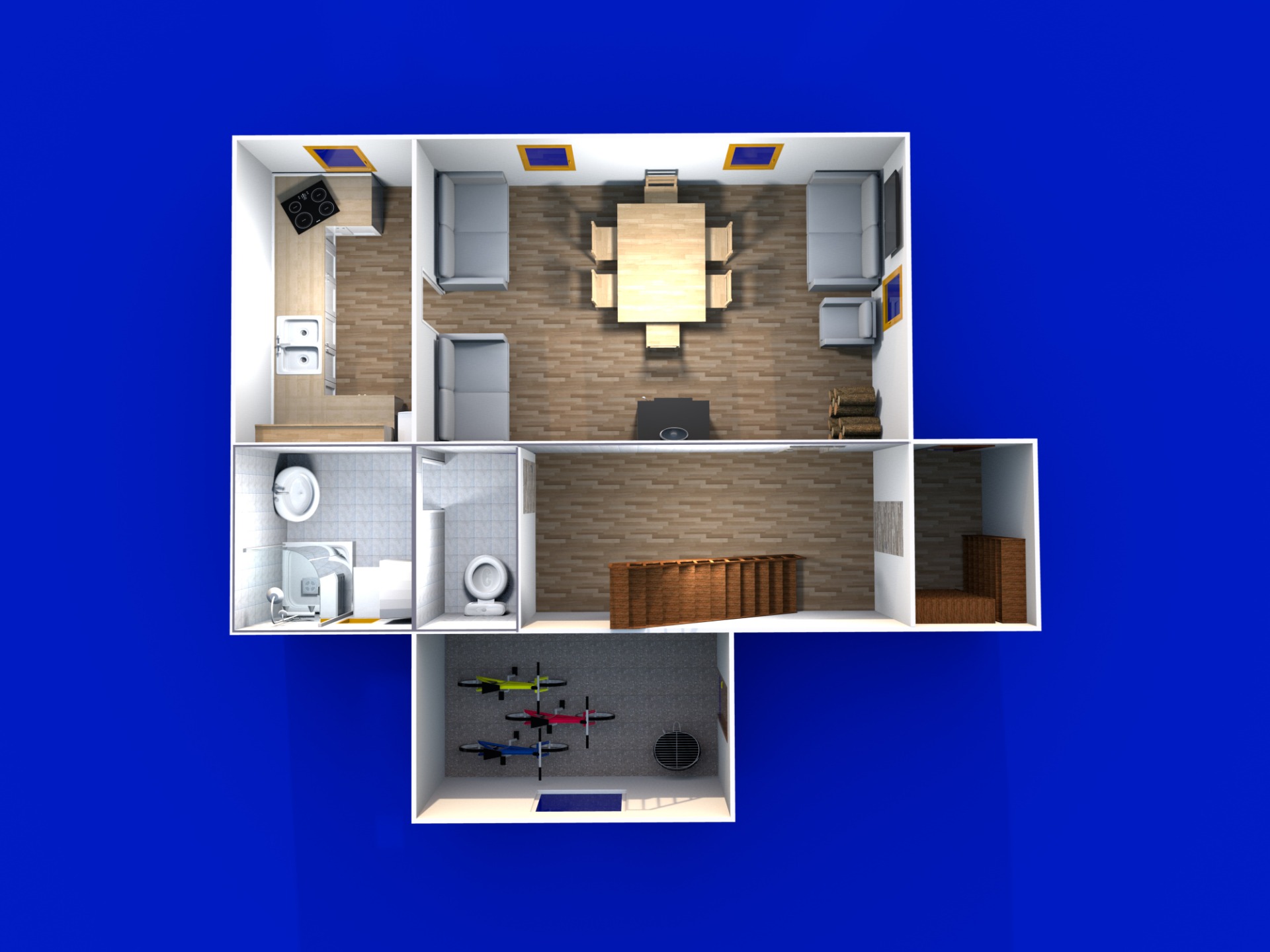 V přízemí se nachází zádvěří, chodba se schodištěm do patra, společenská místnost s krbovými kamny, kuchyň s vestavěnými spotřebiči plně vybavená nádobím a koupelna s wc a sprchovým koutem. Dále pak dílna s možností odkládání sportovního vybavení.